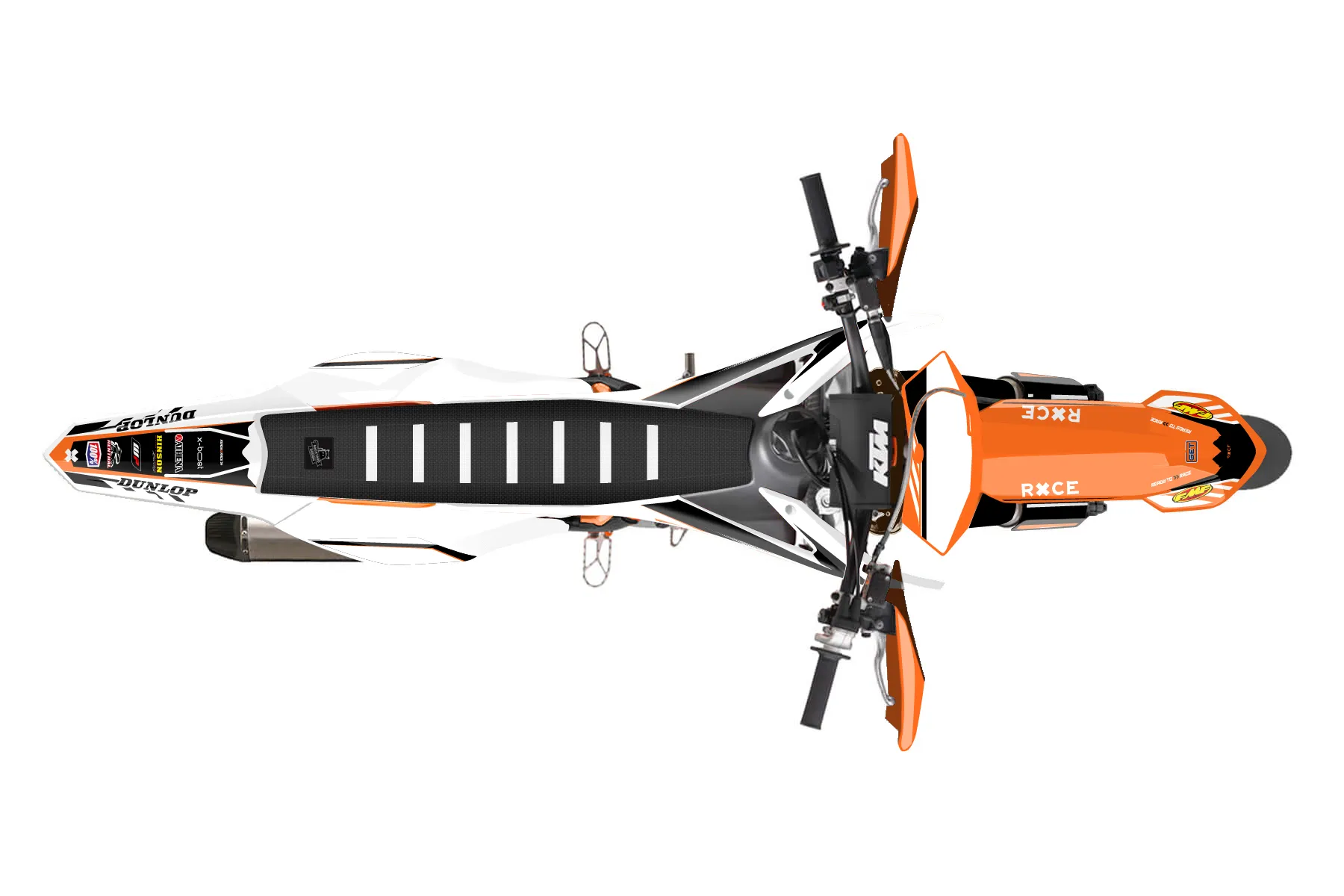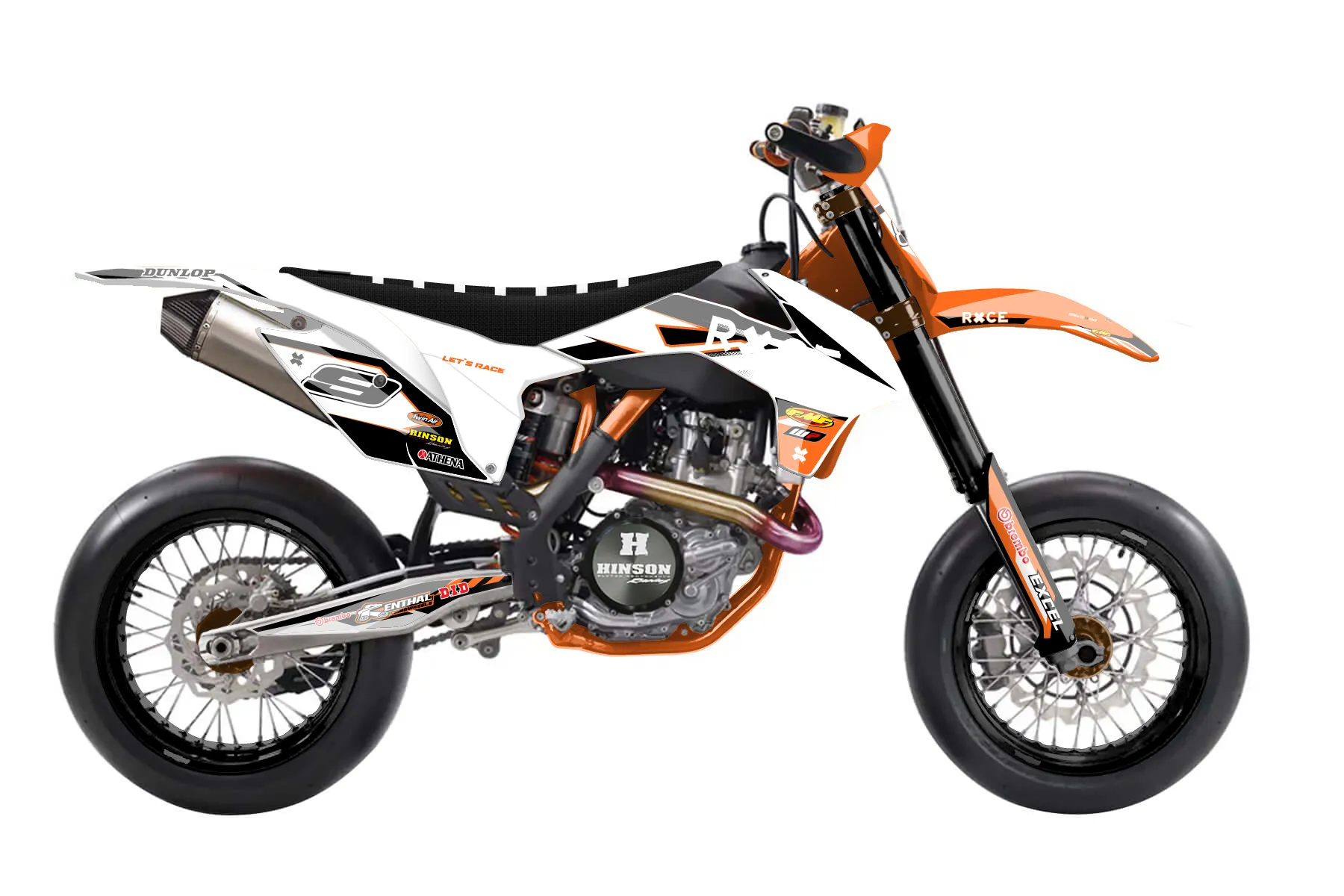 «Club» — готовый комплект графики серии Maverick для KTM Supermoto KTM SMR 450 2013. В комплекте: графика на бак и боковые облицовки, крылья (переднее и заднее), передний щиток, номерные таблички, защита вилки. Материал: ПВХ-винил 80 мкр с холодной ламинацией 300 мкр, общая толщина 380 мкр; покрытие глянцевое или матовое на выбор. Устойчив к UV-излучению, воде, бензину и мойке высокого давления. Клей акриловый на сольвентной основе — постоянный, для гибких пластиков. На простых поверхностях монтируется без нагрева; для сложных изгибов рекомендуем фен. Этот пресет можно заказать как есть или взять за основу в конструкторе: поменять цвета, добавить стартовый номер и свой бренд. Производство — 3–5 рабочих дней, доставка по России СДЭКом или Почтой, по СНГ — курьерскими службами.