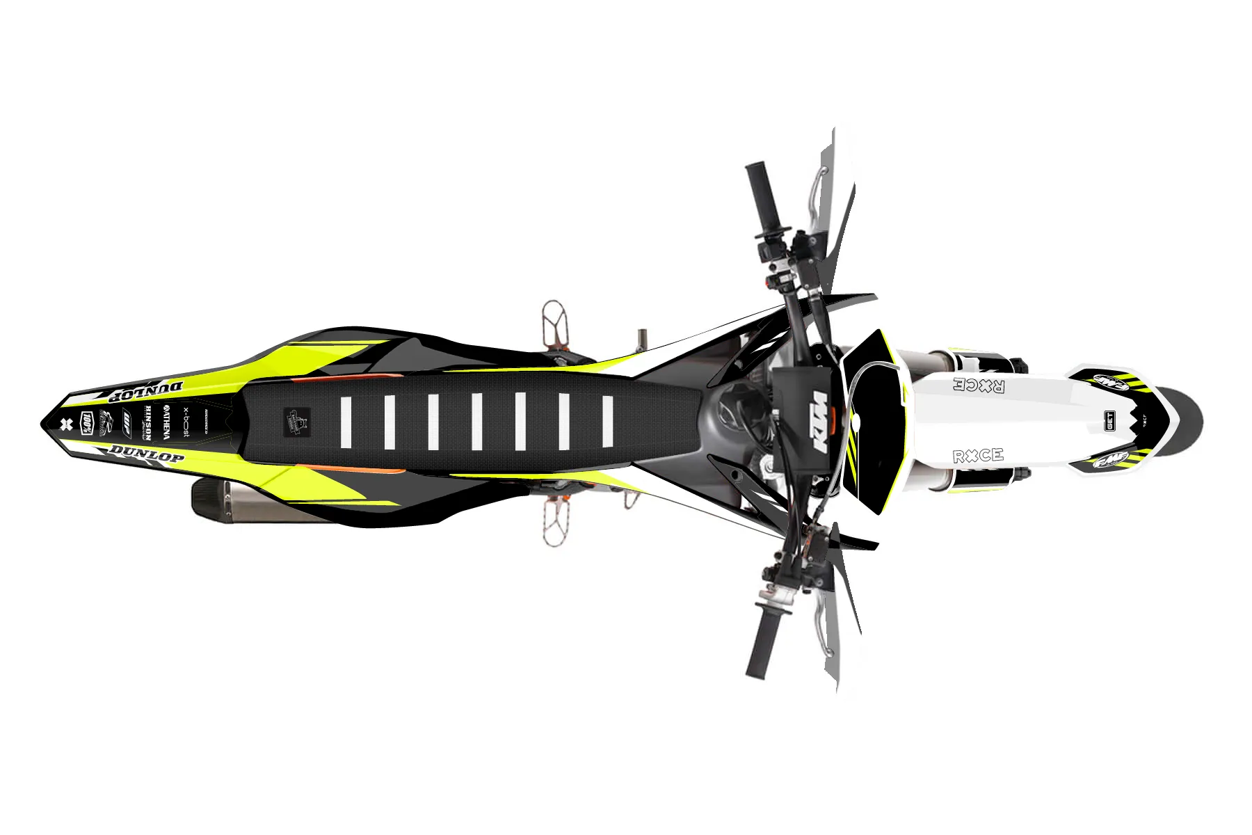 «Grip Neon» — готовый комплект графики серии Maverick для KTM Supermoto KTM SMR 450 2013. В комплекте: графика на бак и боковые облицовки, крылья (переднее и заднее), передний щиток, номерные таблички, защита вилки. Материал: ПВХ-винил 80 мкр с холодной ламинацией 300 мкр, общая толщина 380 мкр; покрытие глянцевое или матовое на выбор. Устойчив к UV-излучению, воде, бензину и мойке высокого давления. Клей акриловый на сольвентной основе — постоянный, для гибких пластиков. На простых поверхностях монтируется без нагрева; для сложных изгибов рекомендуем фен. Этот пресет можно заказать как есть или взять за основу в конструкторе: поменять цвета, добавить стартовый номер и свой бренд. Производство — 3–5 рабочих дней, доставка по России СДЭКом или Почтой, по СНГ — курьерскими службами.