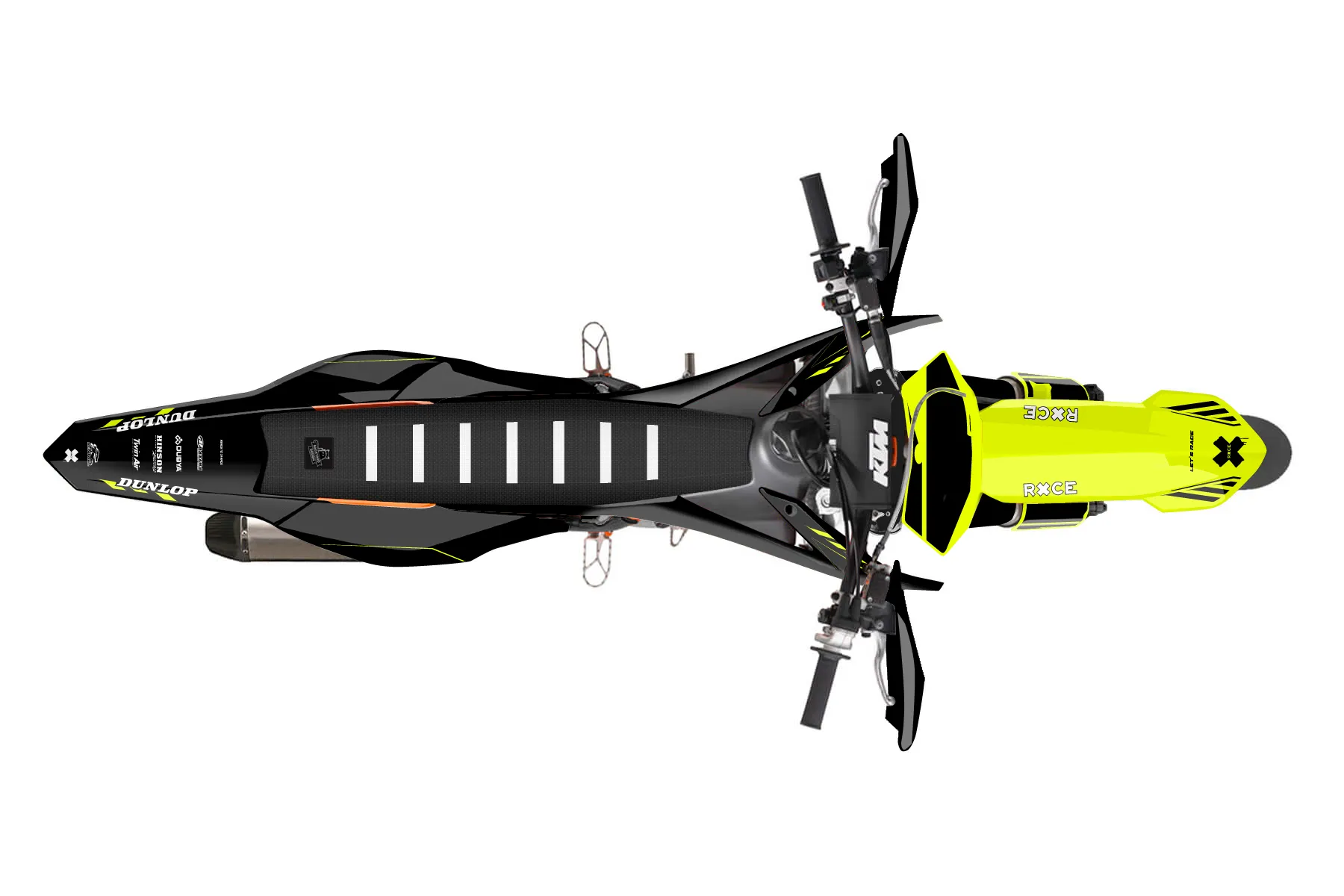 «Kitted Neon» — готовый комплект графики серии Maverick для KTM Supermoto KTM SMR 450 2013. В комплекте: графика на бак и боковые облицовки, крылья (переднее и заднее), передний щиток, номерные таблички, защита вилки. Материал: ПВХ-винил 80 мкр с холодной ламинацией 300 мкр, общая толщина 380 мкр; покрытие глянцевое или матовое на выбор. Устойчив к UV-излучению, воде, бензину и мойке высокого давления. Клей акриловый на сольвентной основе — постоянный, для гибких пластиков. На простых поверхностях монтируется без нагрева; для сложных изгибов рекомендуем фен. Этот пресет можно заказать как есть или взять за основу в конструкторе: поменять цвета, добавить стартовый номер и свой бренд. Производство — 3–5 рабочих дней, доставка по России СДЭКом или Почтой, по СНГ — курьерскими службами.