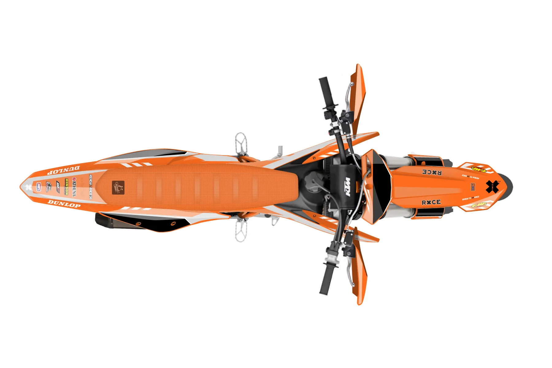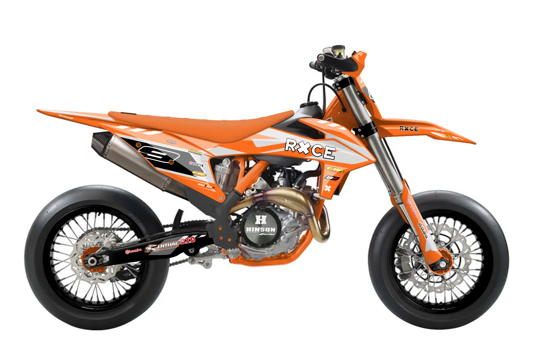 «Express» — готовый комплект графики серии Maverick для KTM Supermoto KTM SMR 450 2021. В комплекте: графика на бак и боковые облицовки, крылья (переднее и заднее), передний щиток, номерные таблички, защита вилки. Материал: ПВХ-винил 80 мкр с холодной ламинацией 300 мкр, общая толщина 380 мкр; покрытие глянцевое или матовое на выбор. Устойчив к UV-излучению, воде, бензину и мойке высокого давления. Клей акриловый на сольвентной основе — постоянный, для гибких пластиков. На простых поверхностях монтируется без нагрева; для сложных изгибов рекомендуем фен. Этот пресет можно заказать как есть или взять за основу в конструкторе: поменять цвета, добавить стартовый номер и свой бренд. Производство — 3–5 рабочих дней, доставка по России СДЭКом или Почтой, по СНГ — курьерскими службами.