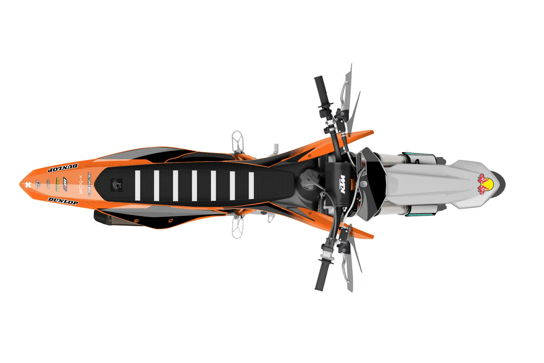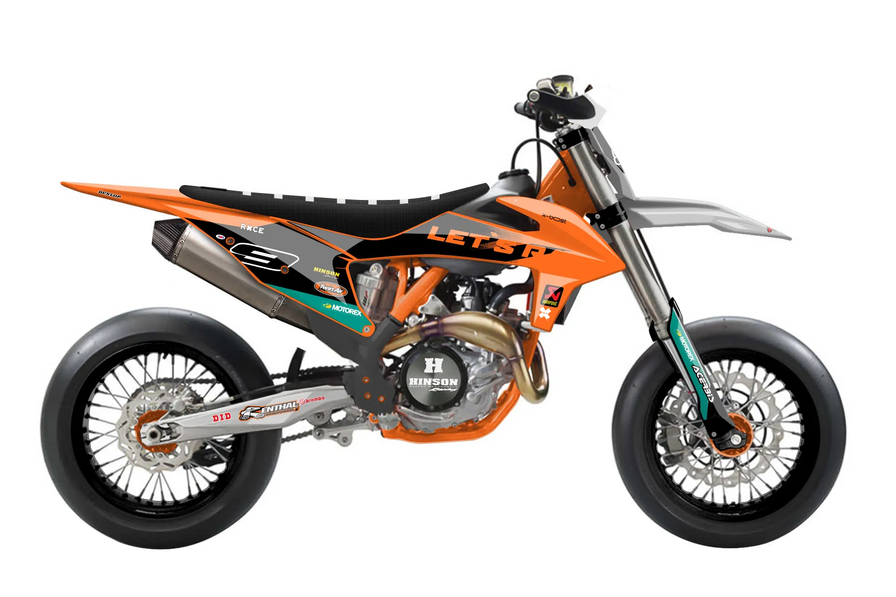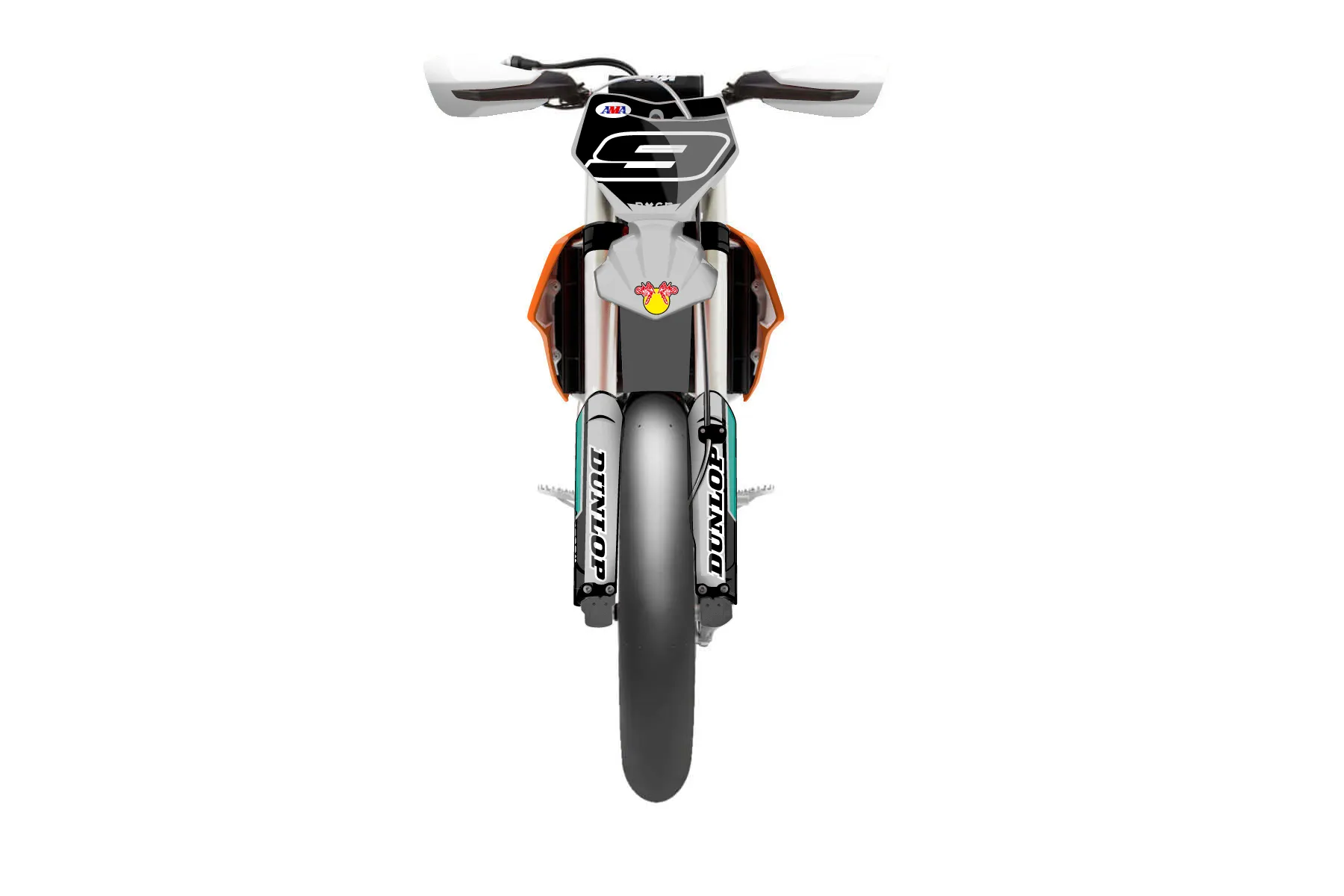 «Fuse» — готовый комплект графики серии Maverick для KTM Supermoto KTM SMR 450 2021. В комплекте: графика на бак и боковые облицовки, крылья (переднее и заднее), передний щиток, номерные таблички, защита вилки. Материал: ПВХ-винил 80 мкр с холодной ламинацией 300 мкр, общая толщина 380 мкр; покрытие глянцевое или матовое на выбор. Устойчив к UV-излучению, воде, бензину и мойке высокого давления. Клей акриловый на сольвентной основе — постоянный, для гибких пластиков. На простых поверхностях монтируется без нагрева; для сложных изгибов рекомендуем фен. Этот пресет можно заказать как есть или взять за основу в конструкторе: поменять цвета, добавить стартовый номер и свой бренд. Производство — 3–5 рабочих дней, доставка по России СДЭКом или Почтой, по СНГ — курьерскими службами.