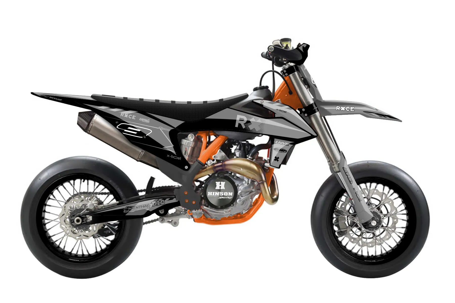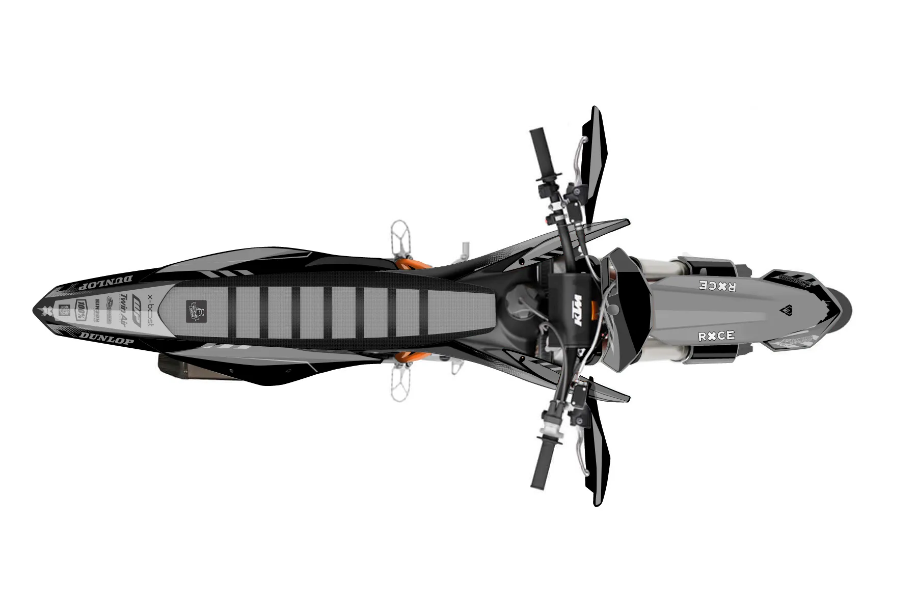 «Grip» — готовый комплект графики серии Maverick для KTM Supermoto KTM SMR 450 2021. В комплекте: графика на бак и боковые облицовки, крылья (переднее и заднее), передний щиток, номерные таблички, защита вилки. Материал: ПВХ-винил 80 мкр с холодной ламинацией 300 мкр, общая толщина 380 мкр; покрытие глянцевое или матовое на выбор. Устойчив к UV-излучению, воде, бензину и мойке высокого давления. Клей акриловый на сольвентной основе — постоянный, для гибких пластиков. На простых поверхностях монтируется без нагрева; для сложных изгибов рекомендуем фен. Этот пресет можно заказать как есть или взять за основу в конструкторе: поменять цвета, добавить стартовый номер и свой бренд. Производство — 3–5 рабочих дней, доставка по России СДЭКом или Почтой, по СНГ — курьерскими службами.