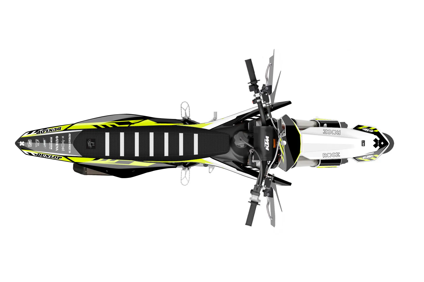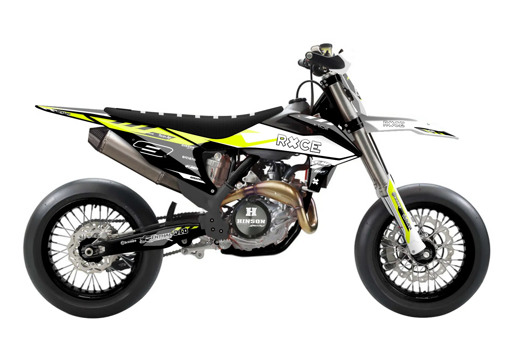 «Grip Neon» — готовый комплект графики серии Maverick для KTM Supermoto KTM SMR 450 2021. В комплекте: графика на бак и боковые облицовки, крылья (переднее и заднее), передний щиток, номерные таблички, защита вилки. Материал: ПВХ-винил 80 мкр с холодной ламинацией 300 мкр, общая толщина 380 мкр; покрытие глянцевое или матовое на выбор. Устойчив к UV-излучению, воде, бензину и мойке высокого давления. Клей акриловый на сольвентной основе — постоянный, для гибких пластиков. На простых поверхностях монтируется без нагрева; для сложных изгибов рекомендуем фен. Этот пресет можно заказать как есть или взять за основу в конструкторе: поменять цвета, добавить стартовый номер и свой бренд. Производство — 3–5 рабочих дней, доставка по России СДЭКом или Почтой, по СНГ — курьерскими службами.