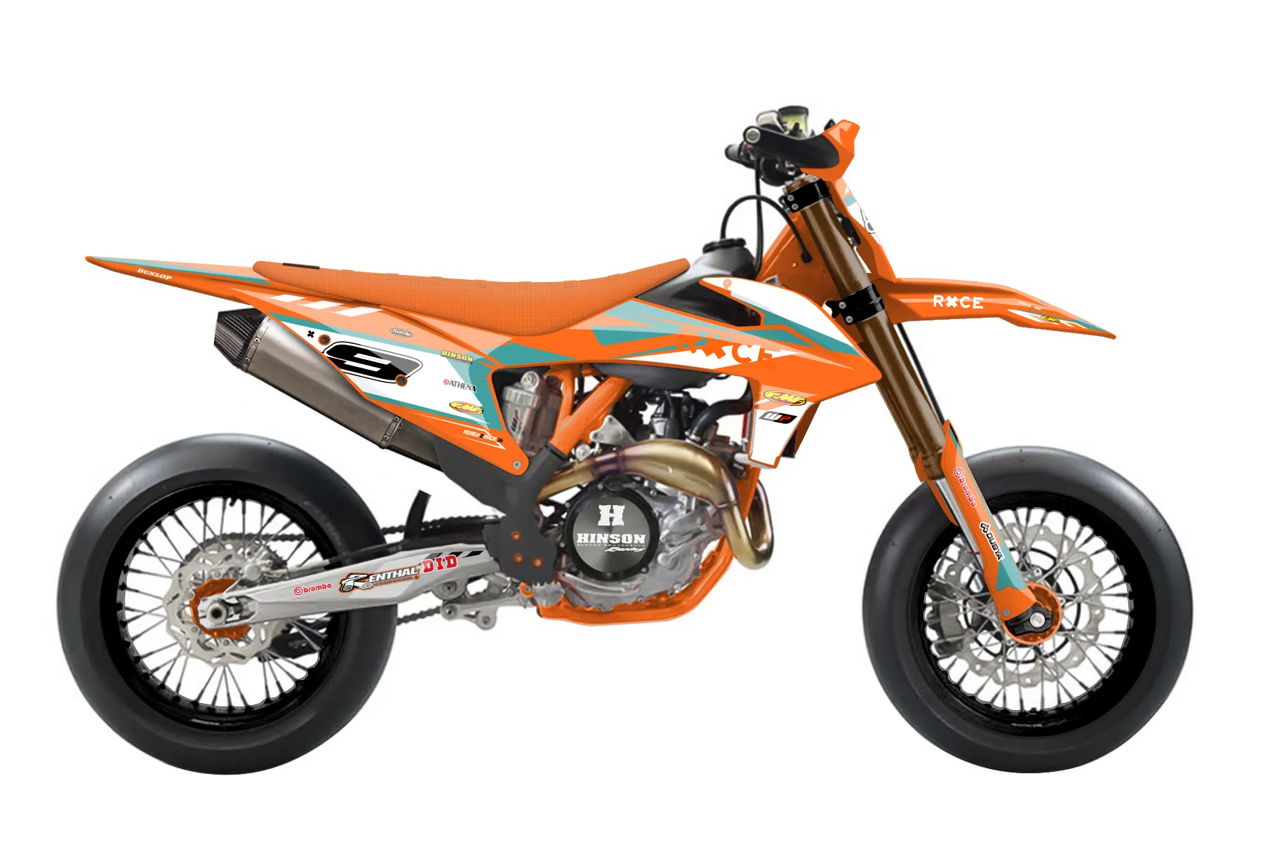 «Rapid» — готовый комплект графики серии Maverick для KTM Supermoto KTM SMR 450 2021. В комплекте: графика на бак и боковые облицовки, крылья (переднее и заднее), передний щиток, номерные таблички, защита вилки. Материал: ПВХ-винил 80 мкр с холодной ламинацией 300 мкр, общая толщина 380 мкр; покрытие глянцевое или матовое на выбор. Устойчив к UV-излучению, воде, бензину и мойке высокого давления. Клей акриловый на сольвентной основе — постоянный, для гибких пластиков. На простых поверхностях монтируется без нагрева; для сложных изгибов рекомендуем фен. Этот пресет можно заказать как есть или взять за основу в конструкторе: поменять цвета, добавить стартовый номер и свой бренд. Производство — 3–5 рабочих дней, доставка по России СДЭКом или Почтой, по СНГ — курьерскими службами.