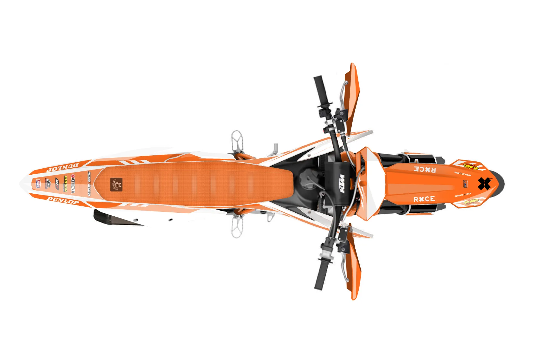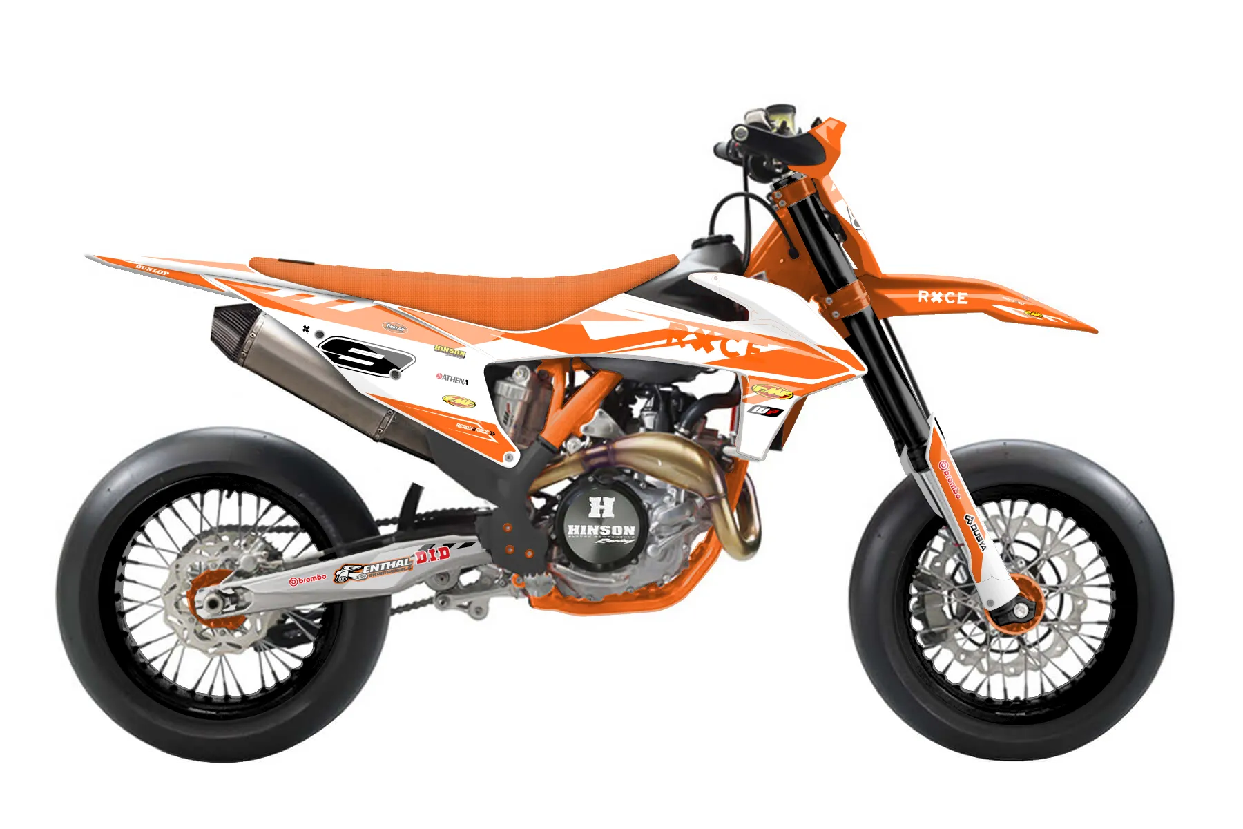 «Swapp» — готовый комплект графики серии Maverick для KTM Supermoto KTM SMR 450 2021. В комплекте: графика на бак и боковые облицовки, крылья (переднее и заднее), передний щиток, номерные таблички, защита вилки. Материал: ПВХ-винил 80 мкр с холодной ламинацией 300 мкр, общая толщина 380 мкр; покрытие глянцевое или матовое на выбор. Устойчив к UV-излучению, воде, бензину и мойке высокого давления. Клей акриловый на сольвентной основе — постоянный, для гибких пластиков. На простых поверхностях монтируется без нагрева; для сложных изгибов рекомендуем фен. Этот пресет можно заказать как есть или взять за основу в конструкторе: поменять цвета, добавить стартовый номер и свой бренд. Производство — 3–5 рабочих дней, доставка по России СДЭКом или Почтой, по СНГ — курьерскими службами.