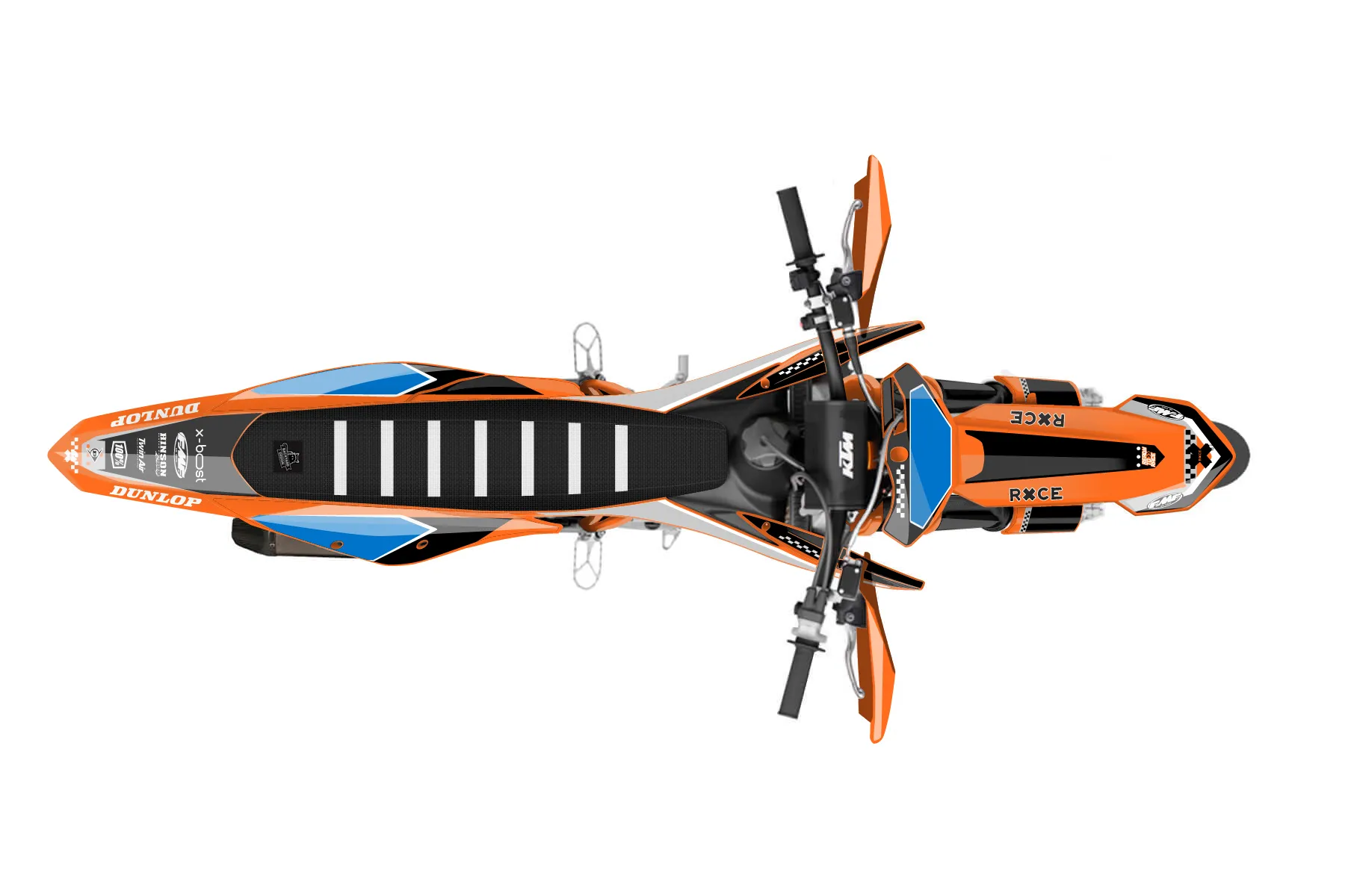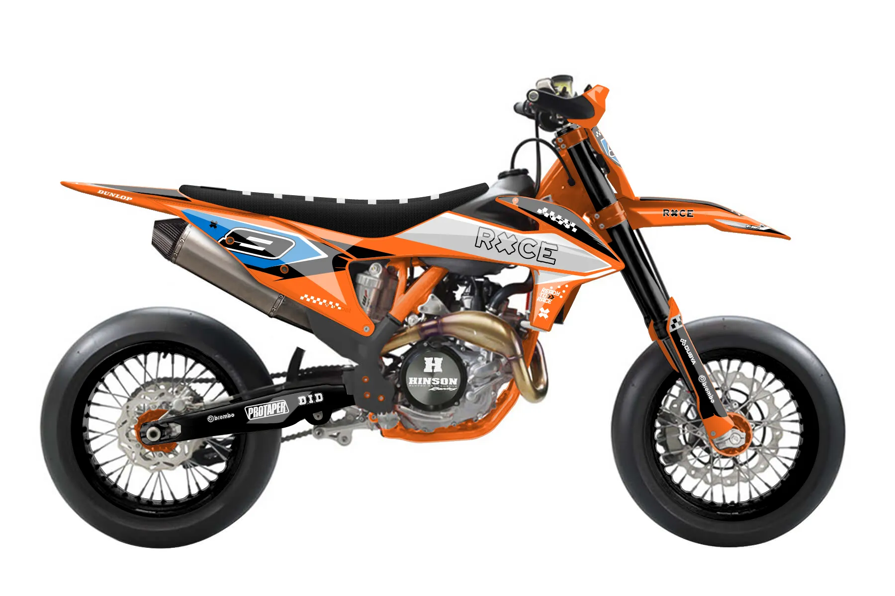 «Clean» — готовый комплект графики серии Staple для KTM Supermoto KTM SMR 450 2021. В комплекте: графика на бак и боковые облицовки, крылья (переднее и заднее), передний щиток, номерные таблички, защита вилки. Материал: ПВХ-винил 80 мкр с холодной ламинацией 300 мкр, общая толщина 380 мкр; покрытие глянцевое или матовое на выбор. Устойчив к UV-излучению, воде, бензину и мойке высокого давления. Клей акриловый на сольвентной основе — постоянный, для гибких пластиков. На простых поверхностях монтируется без нагрева; для сложных изгибов рекомендуем фен. Этот пресет можно заказать как есть или взять за основу в конструкторе: поменять цвета, добавить стартовый номер и свой бренд. Производство — 3–5 рабочих дней, доставка по России СДЭКом или Почтой, по СНГ — курьерскими службами.