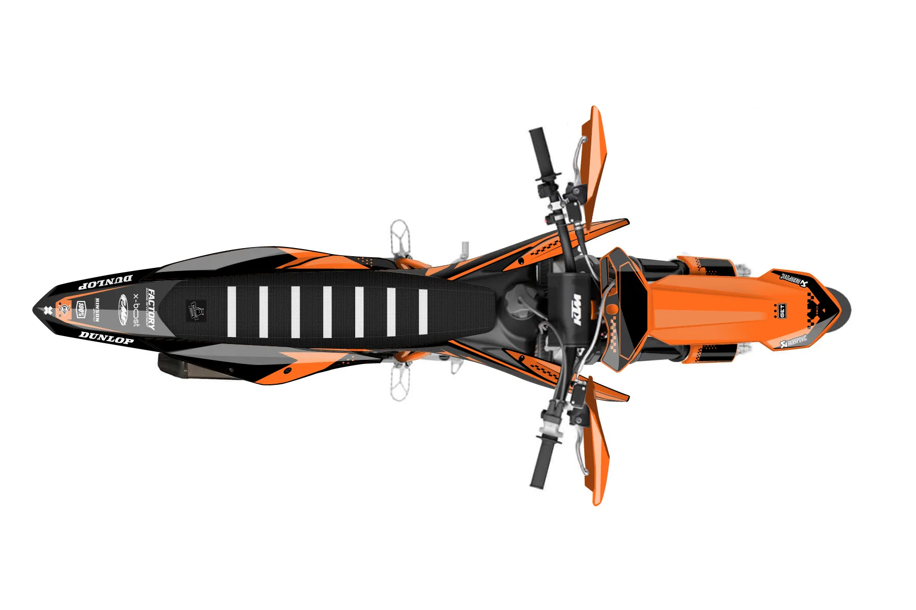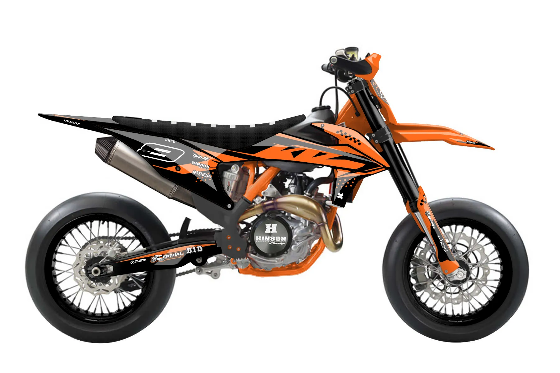 «Trait» — готовый комплект графики серии Staple для KTM Supermoto KTM SMR 450 2021. В комплекте: графика на бак и боковые облицовки, крылья (переднее и заднее), передний щиток, номерные таблички, защита вилки. Материал: ПВХ-винил 80 мкр с холодной ламинацией 300 мкр, общая толщина 380 мкр; покрытие глянцевое или матовое на выбор. Устойчив к UV-излучению, воде, бензину и мойке высокого давления. Клей акриловый на сольвентной основе — постоянный, для гибких пластиков. На простых поверхностях монтируется без нагрева; для сложных изгибов рекомендуем фен. Этот пресет можно заказать как есть или взять за основу в конструкторе: поменять цвета, добавить стартовый номер и свой бренд. Производство — 3–5 рабочих дней, доставка по России СДЭКом или Почтой, по СНГ — курьерскими службами.