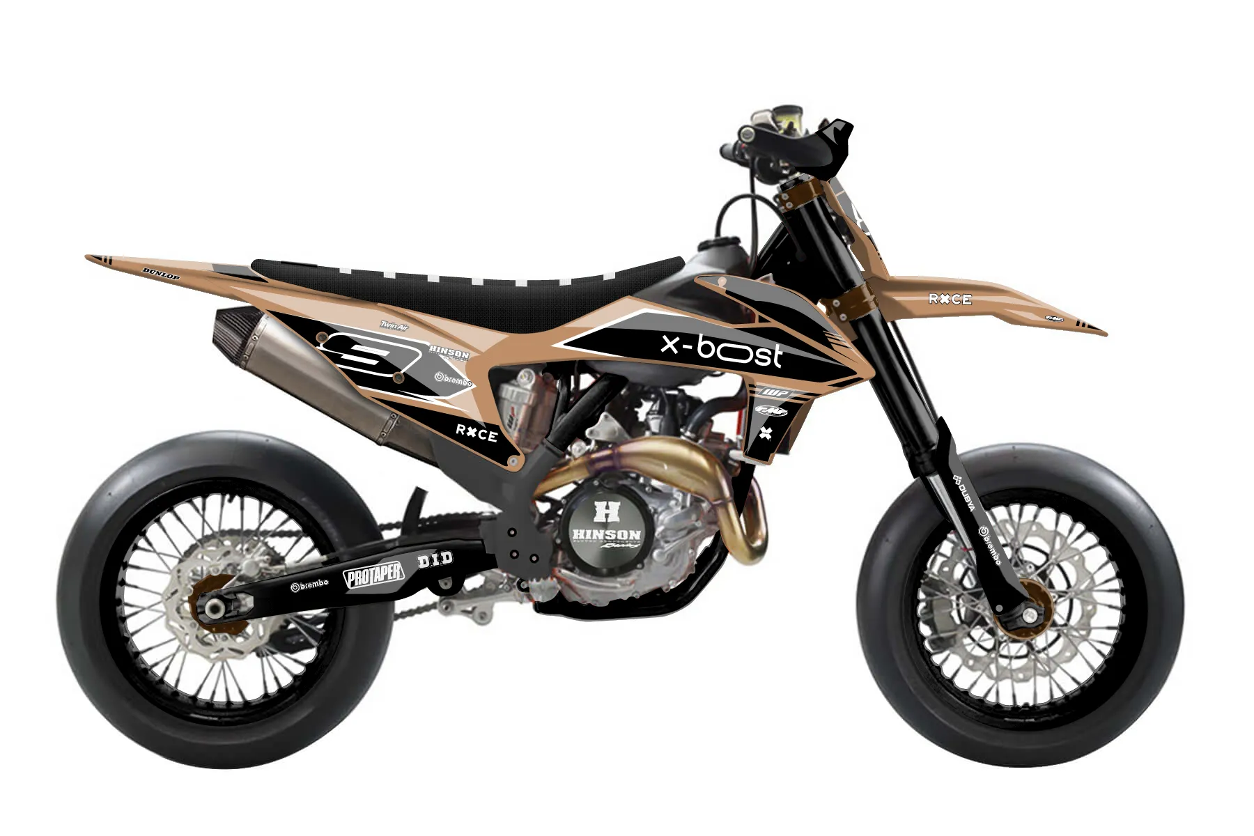 «Entire» — готовый комплект графики серии Untucked для KTM Supermoto KTM SMR 450 2021. В комплекте: графика на бак и боковые облицовки, крылья (переднее и заднее), передний щиток, номерные таблички, защита вилки. Материал: ПВХ-винил 80 мкр с холодной ламинацией 300 мкр, общая толщина 380 мкр; покрытие глянцевое или матовое на выбор. Устойчив к UV-излучению, воде, бензину и мойке высокого давления. Клей акриловый на сольвентной основе — постоянный, для гибких пластиков. На простых поверхностях монтируется без нагрева; для сложных изгибов рекомендуем фен. Этот пресет можно заказать как есть или взять за основу в конструкторе: поменять цвета, добавить стартовый номер и свой бренд. Производство — 3–5 рабочих дней, доставка по России СДЭКом или Почтой, по СНГ — курьерскими службами.