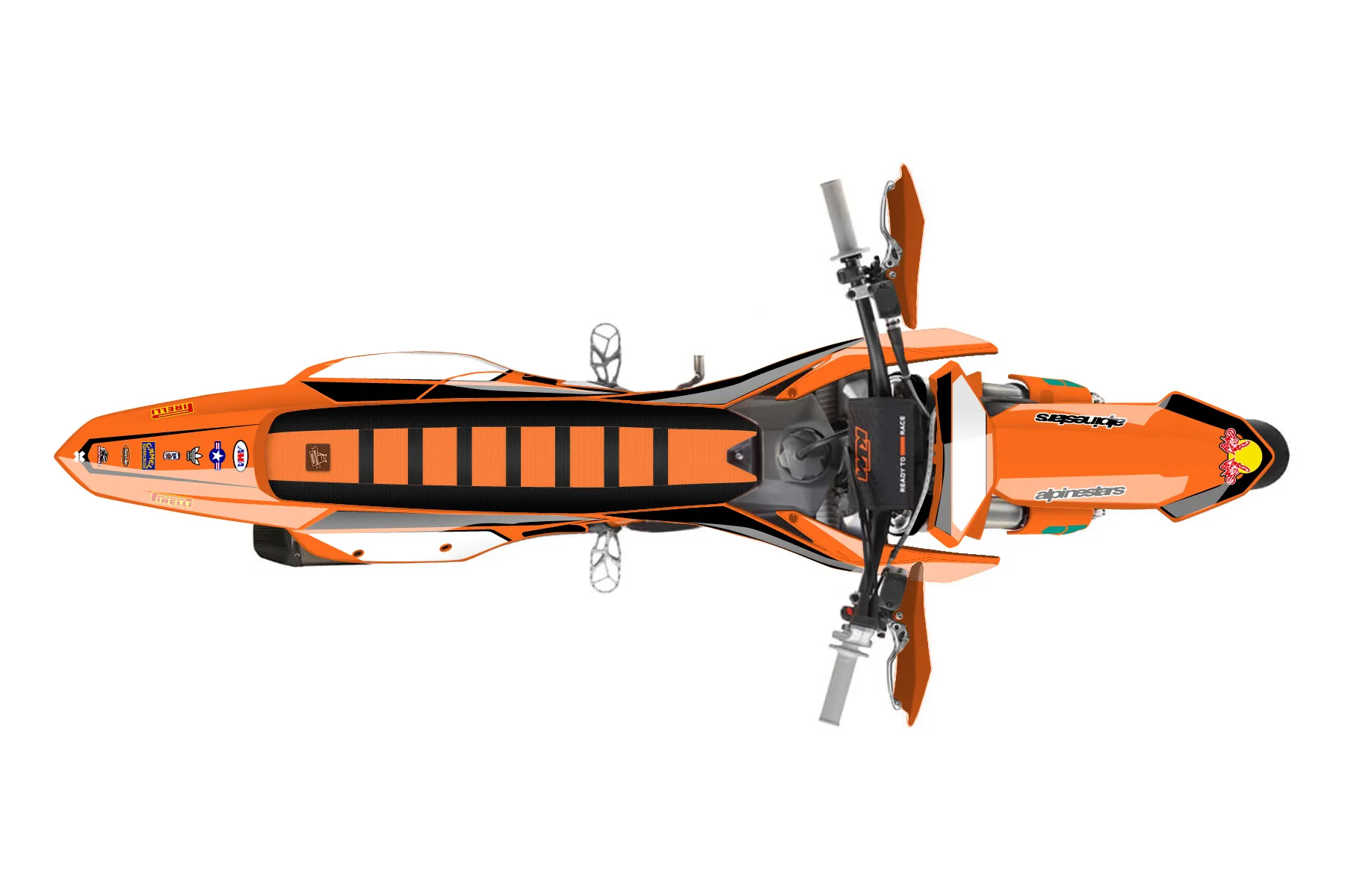 «2023 KTM 450 SMR» — готовый комплект графики серии Flow для KTM Supermoto KTM SMR 450 2025. В комплекте: графика на бак и боковые облицовки, крылья (переднее и заднее), передний щиток, номерные таблички, защита вилки. Материал: ПВХ-винил 80 мкр с холодной ламинацией 300 мкр, общая толщина 380 мкр; покрытие глянцевое или матовое на выбор. Устойчив к UV-излучению, воде, бензину и мойке высокого давления. Клей акриловый на сольвентной основе — постоянный, для гибких пластиков. На простых поверхностях монтируется без нагрева; для сложных изгибов рекомендуем фен. Этот пресет можно заказать как есть или взять за основу в конструкторе: поменять цвета, добавить стартовый номер и свой бренд. Производство — 3–5 рабочих дней, доставка по России СДЭКом или Почтой, по СНГ — курьерскими службами.