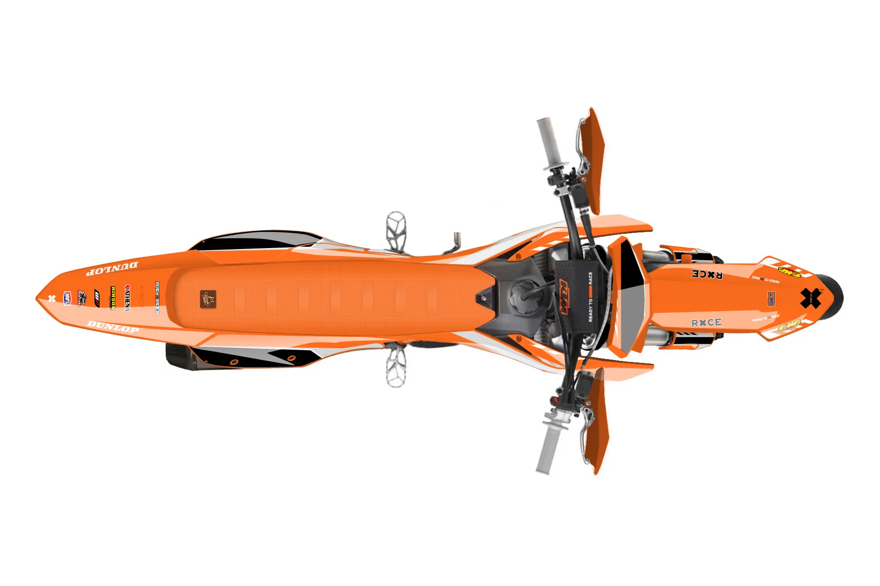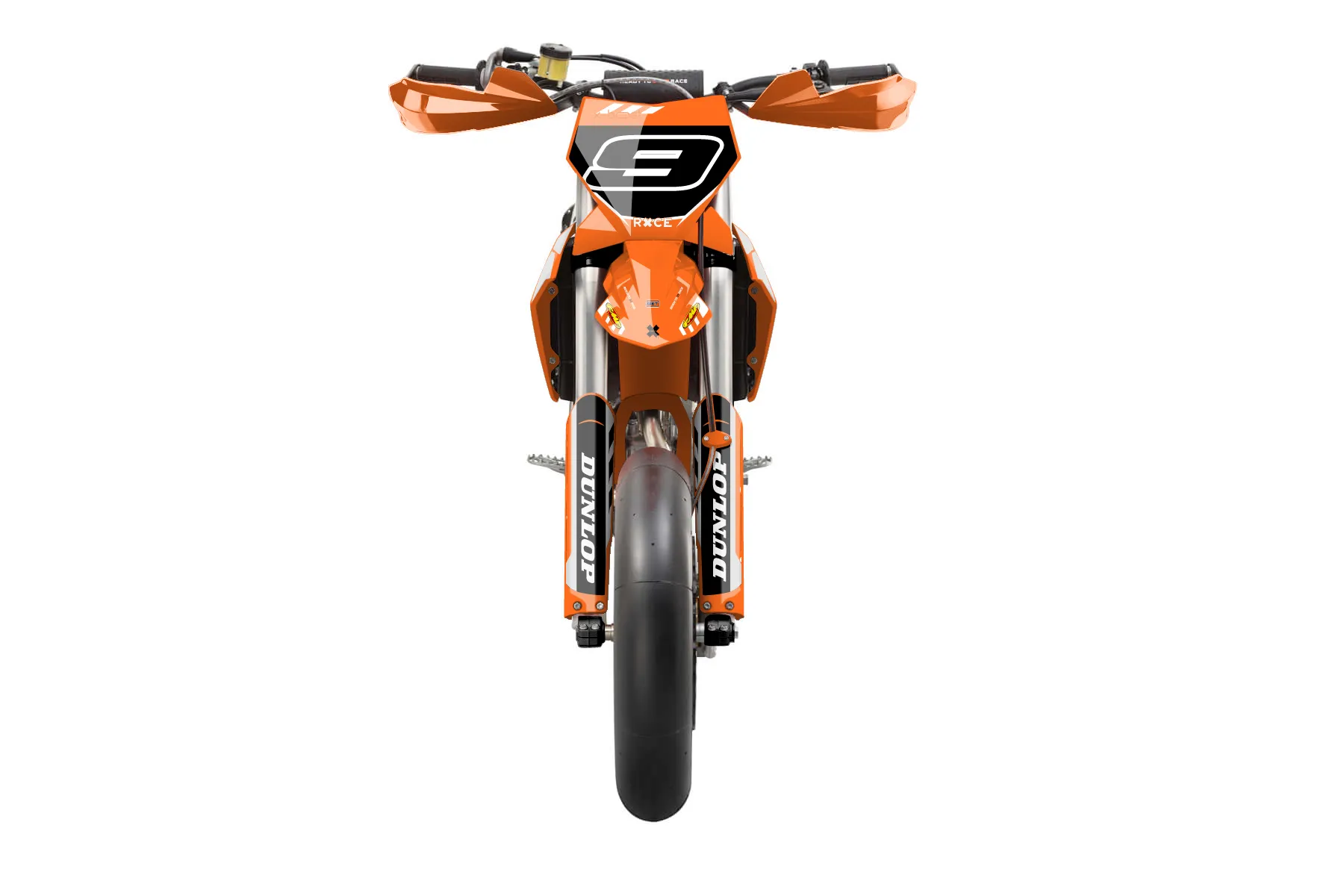 «Express» — готовый комплект графики серии Maverick для KTM Supermoto KTM SMR 450 2025. В комплекте: графика на бак и боковые облицовки, крылья (переднее и заднее), передний щиток, номерные таблички, защита вилки. Материал: ПВХ-винил 80 мкр с холодной ламинацией 300 мкр, общая толщина 380 мкр; покрытие глянцевое или матовое на выбор. Устойчив к UV-излучению, воде, бензину и мойке высокого давления. Клей акриловый на сольвентной основе — постоянный, для гибких пластиков. На простых поверхностях монтируется без нагрева; для сложных изгибов рекомендуем фен. Этот пресет можно заказать как есть или взять за основу в конструкторе: поменять цвета, добавить стартовый номер и свой бренд. Производство — 3–5 рабочих дней, доставка по России СДЭКом или Почтой, по СНГ — курьерскими службами.