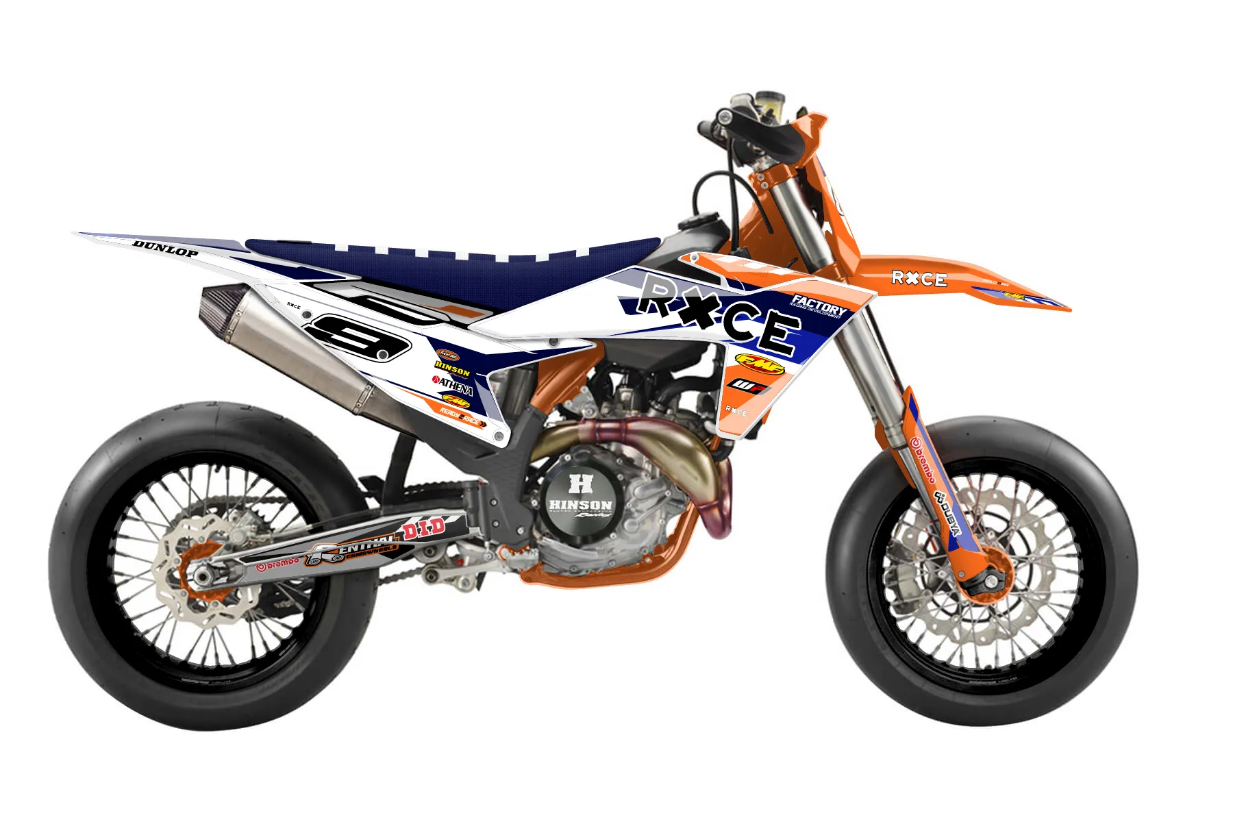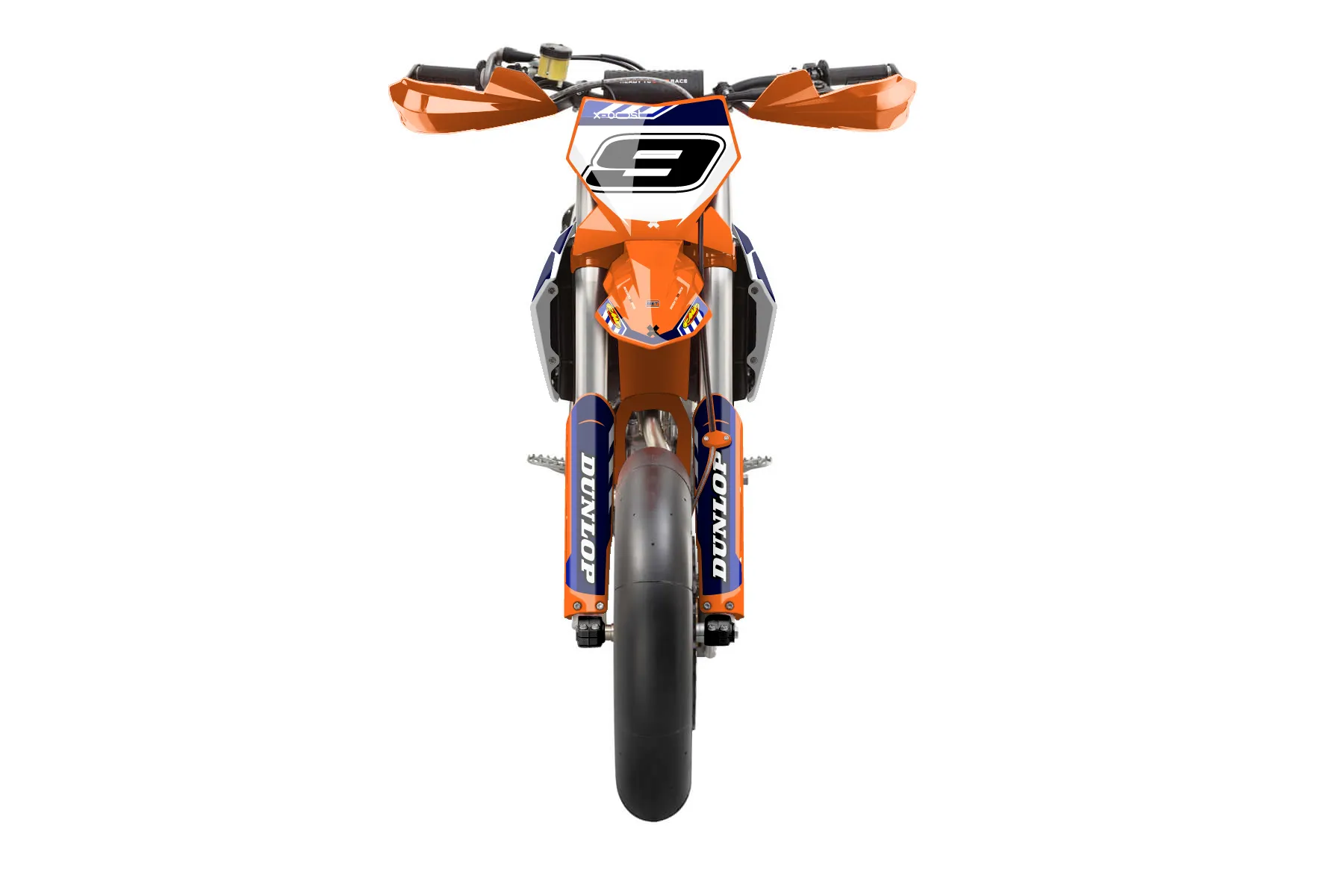 «Fuzion» — готовый комплект графики серии Maverick для KTM Supermoto KTM SMR 450 2025. В комплекте: графика на бак и боковые облицовки, крылья (переднее и заднее), передний щиток, номерные таблички, защита вилки. Материал: ПВХ-винил 80 мкр с холодной ламинацией 300 мкр, общая толщина 380 мкр; покрытие глянцевое или матовое на выбор. Устойчив к UV-излучению, воде, бензину и мойке высокого давления. Клей акриловый на сольвентной основе — постоянный, для гибких пластиков. На простых поверхностях монтируется без нагрева; для сложных изгибов рекомендуем фен. Этот пресет можно заказать как есть или взять за основу в конструкторе: поменять цвета, добавить стартовый номер и свой бренд. Производство — 3–5 рабочих дней, доставка по России СДЭКом или Почтой, по СНГ — курьерскими службами.