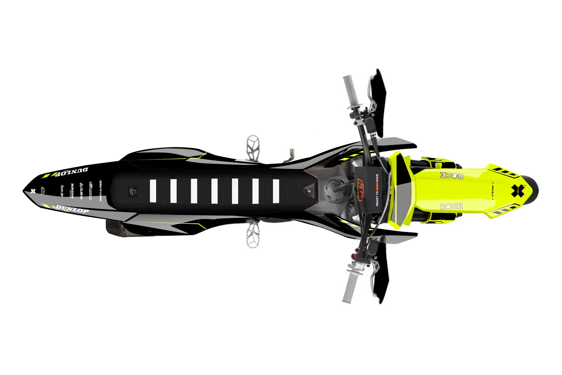«Kitted Neon» — готовый комплект графики серии Maverick для KTM Supermoto KTM SMR 450 2025. В комплекте: графика на бак и боковые облицовки, крылья (переднее и заднее), передний щиток, номерные таблички, защита вилки. Материал: ПВХ-винил 80 мкр с холодной ламинацией 300 мкр, общая толщина 380 мкр; покрытие глянцевое или матовое на выбор. Устойчив к UV-излучению, воде, бензину и мойке высокого давления. Клей акриловый на сольвентной основе — постоянный, для гибких пластиков. На простых поверхностях монтируется без нагрева; для сложных изгибов рекомендуем фен. Этот пресет можно заказать как есть или взять за основу в конструкторе: поменять цвета, добавить стартовый номер и свой бренд. Производство — 3–5 рабочих дней, доставка по России СДЭКом или Почтой, по СНГ — курьерскими службами.