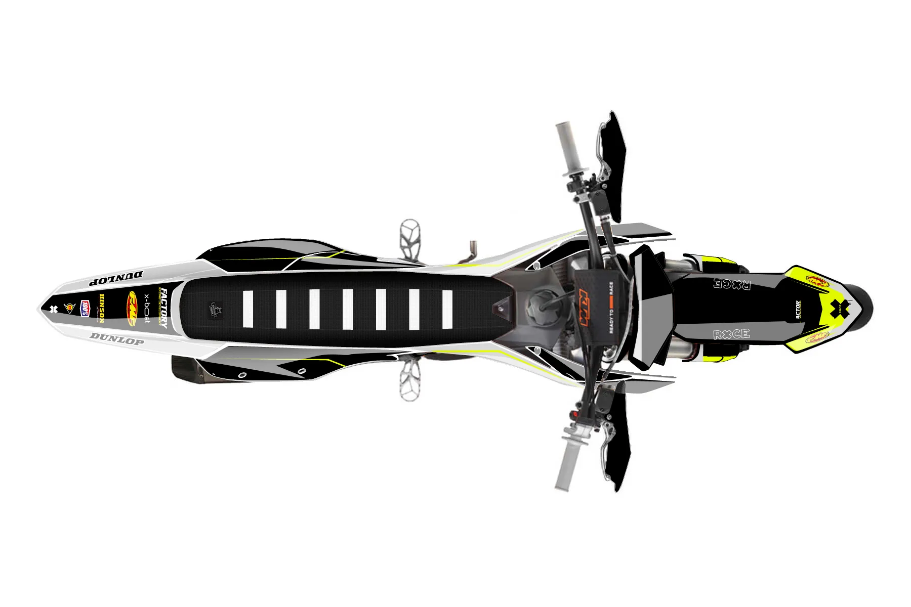 «Close» — готовый комплект графики серии Untucked для KTM Supermoto KTM SMR 450 2025. В комплекте: графика на бак и боковые облицовки, крылья (переднее и заднее), передний щиток, номерные таблички, защита вилки. Материал: ПВХ-винил 80 мкр с холодной ламинацией 300 мкр, общая толщина 380 мкр; покрытие глянцевое или матовое на выбор. Устойчив к UV-излучению, воде, бензину и мойке высокого давления. Клей акриловый на сольвентной основе — постоянный, для гибких пластиков. На простых поверхностях монтируется без нагрева; для сложных изгибов рекомендуем фен. Этот пресет можно заказать как есть или взять за основу в конструкторе: поменять цвета, добавить стартовый номер и свой бренд. Производство — 3–5 рабочих дней, доставка по России СДЭКом или Почтой, по СНГ — курьерскими службами.