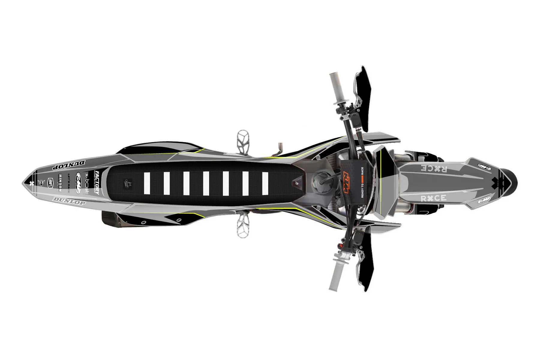 «Warp Neon» — готовый комплект графики серии Untucked для KTM Supermoto KTM SMR 450 2025. В комплекте: графика на бак и боковые облицовки, крылья (переднее и заднее), передний щиток, номерные таблички, защита вилки. Материал: ПВХ-винил 80 мкр с холодной ламинацией 300 мкр, общая толщина 380 мкр; покрытие глянцевое или матовое на выбор. Устойчив к UV-излучению, воде, бензину и мойке высокого давления. Клей акриловый на сольвентной основе — постоянный, для гибких пластиков. На простых поверхностях монтируется без нагрева; для сложных изгибов рекомендуем фен. Этот пресет можно заказать как есть или взять за основу в конструкторе: поменять цвета, добавить стартовый номер и свой бренд. Производство — 3–5 рабочих дней, доставка по России СДЭКом или Почтой, по СНГ — курьерскими службами.