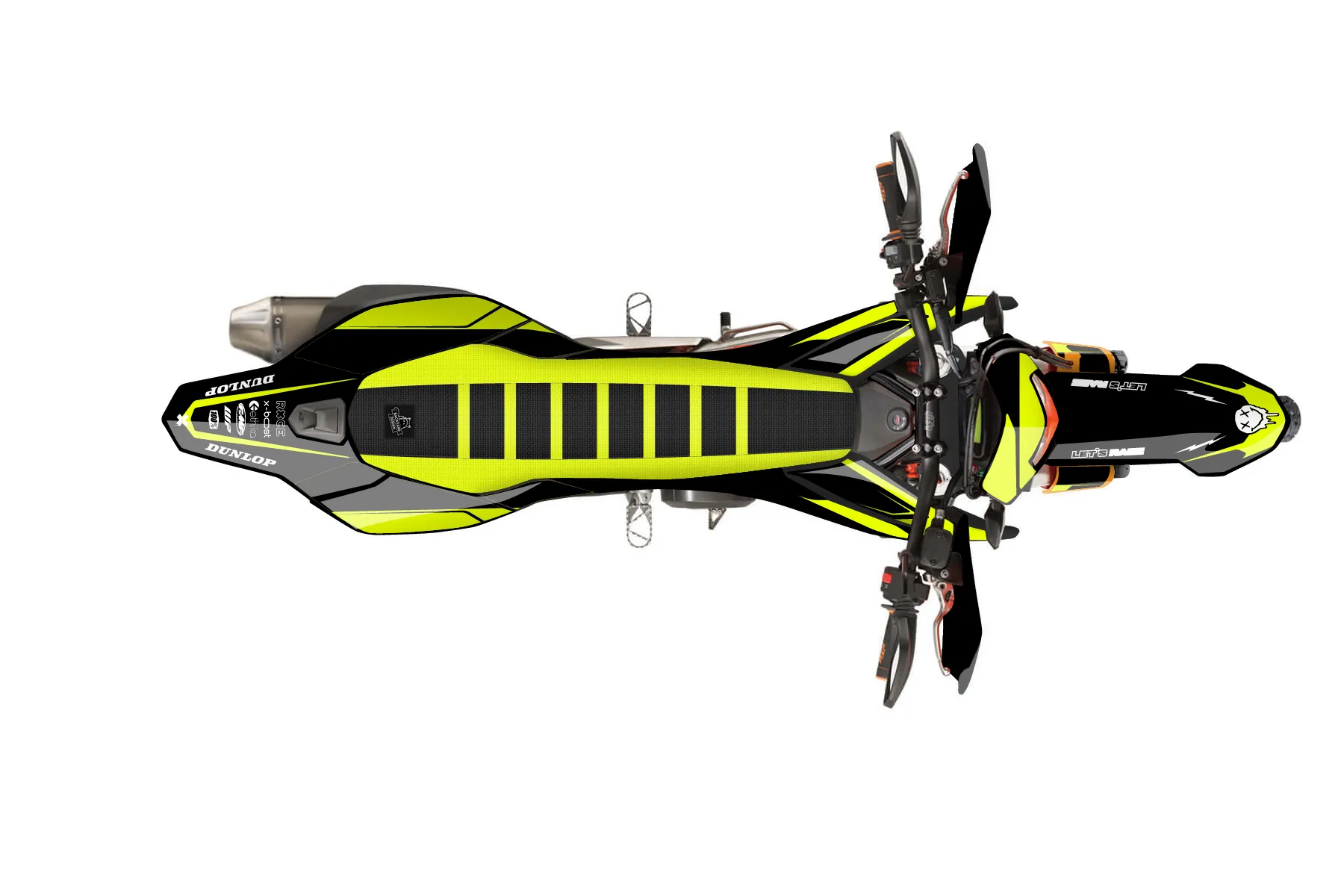 «Grip Neon» — готовый комплект графики серии Flow для KTM Street Graphic Kit KTM SMC-R 690 2012. В комплекте: графика на бак и боковые облицовки, крылья (переднее и заднее), передний щиток, номерные таблички, защита вилки. Материал: ПВХ-винил 80 мкр с холодной ламинацией 300 мкр, общая толщина 380 мкр; покрытие глянцевое или матовое на выбор. Устойчив к UV-излучению, воде, бензину и мойке высокого давления. Клей акриловый на сольвентной основе — постоянный, для гибких пластиков. На простых поверхностях монтируется без нагрева; для сложных изгибов рекомендуем фен. Этот пресет можно заказать как есть или взять за основу в конструкторе: поменять цвета, добавить стартовый номер и свой бренд. Производство — 3–5 рабочих дней, доставка по России СДЭКом или Почтой, по СНГ — курьерскими службами.