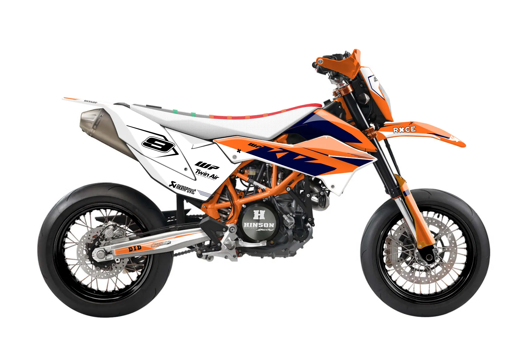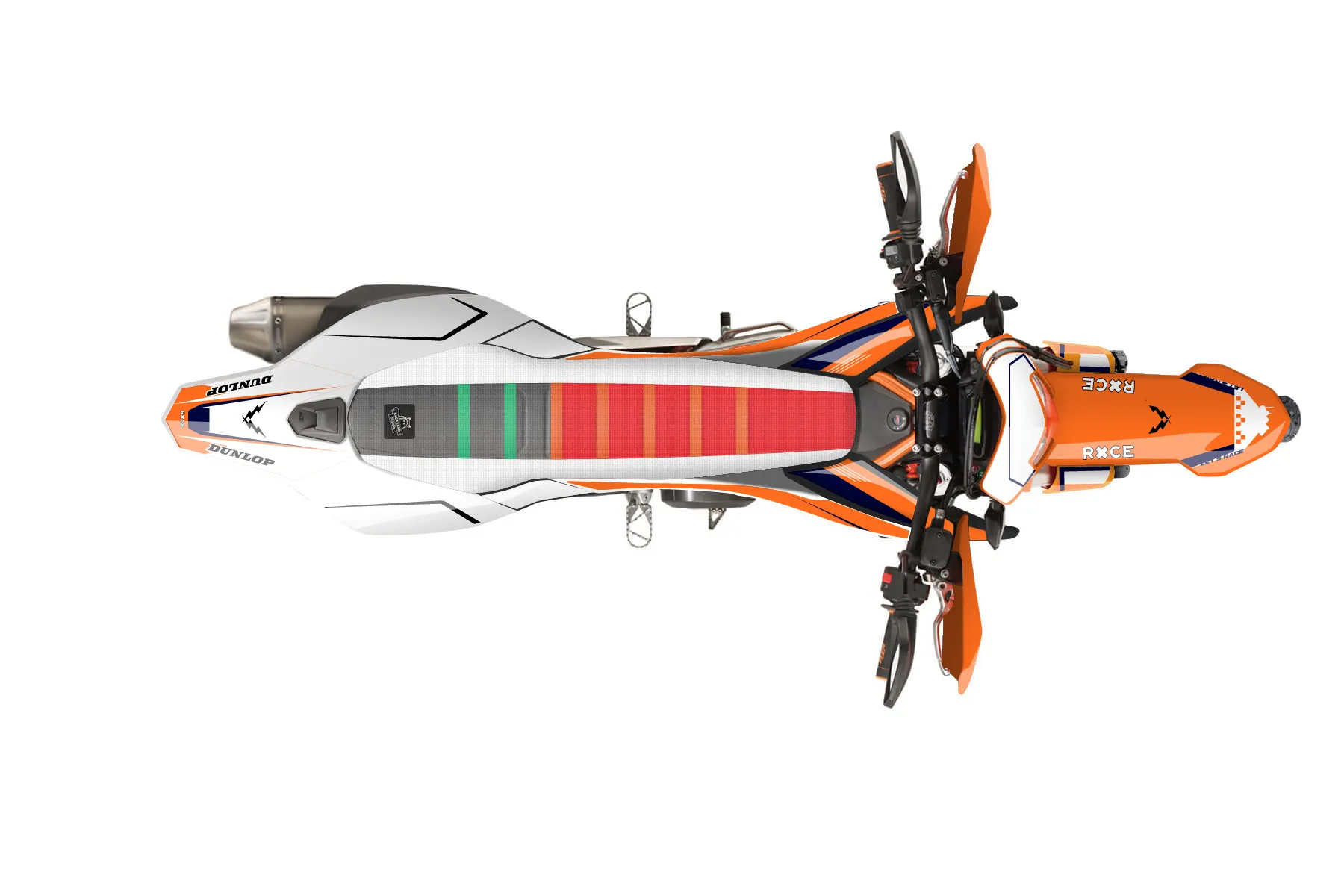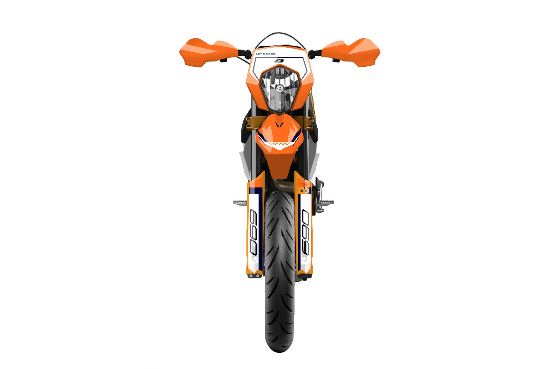 «Extreme» — готовый комплект графики серии Staple для KTM Street Graphic Kit KTM SMC-R 690 2012. В комплекте: графика на бак и боковые облицовки, крылья (переднее и заднее), передний щиток, номерные таблички, защита вилки. Материал: ПВХ-винил 80 мкр с холодной ламинацией 300 мкр, общая толщина 380 мкр; покрытие глянцевое или матовое на выбор. Устойчив к UV-излучению, воде, бензину и мойке высокого давления. Клей акриловый на сольвентной основе — постоянный, для гибких пластиков. На простых поверхностях монтируется без нагрева; для сложных изгибов рекомендуем фен. Этот пресет можно заказать как есть или взять за основу в конструкторе: поменять цвета, добавить стартовый номер и свой бренд. Производство — 3–5 рабочих дней, доставка по России СДЭКом или Почтой, по СНГ — курьерскими службами.