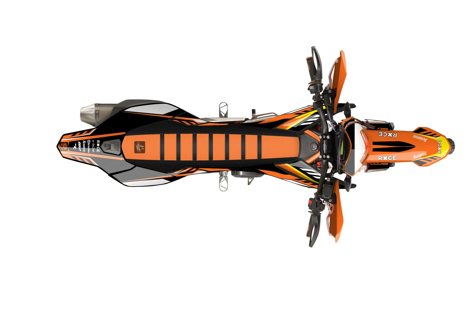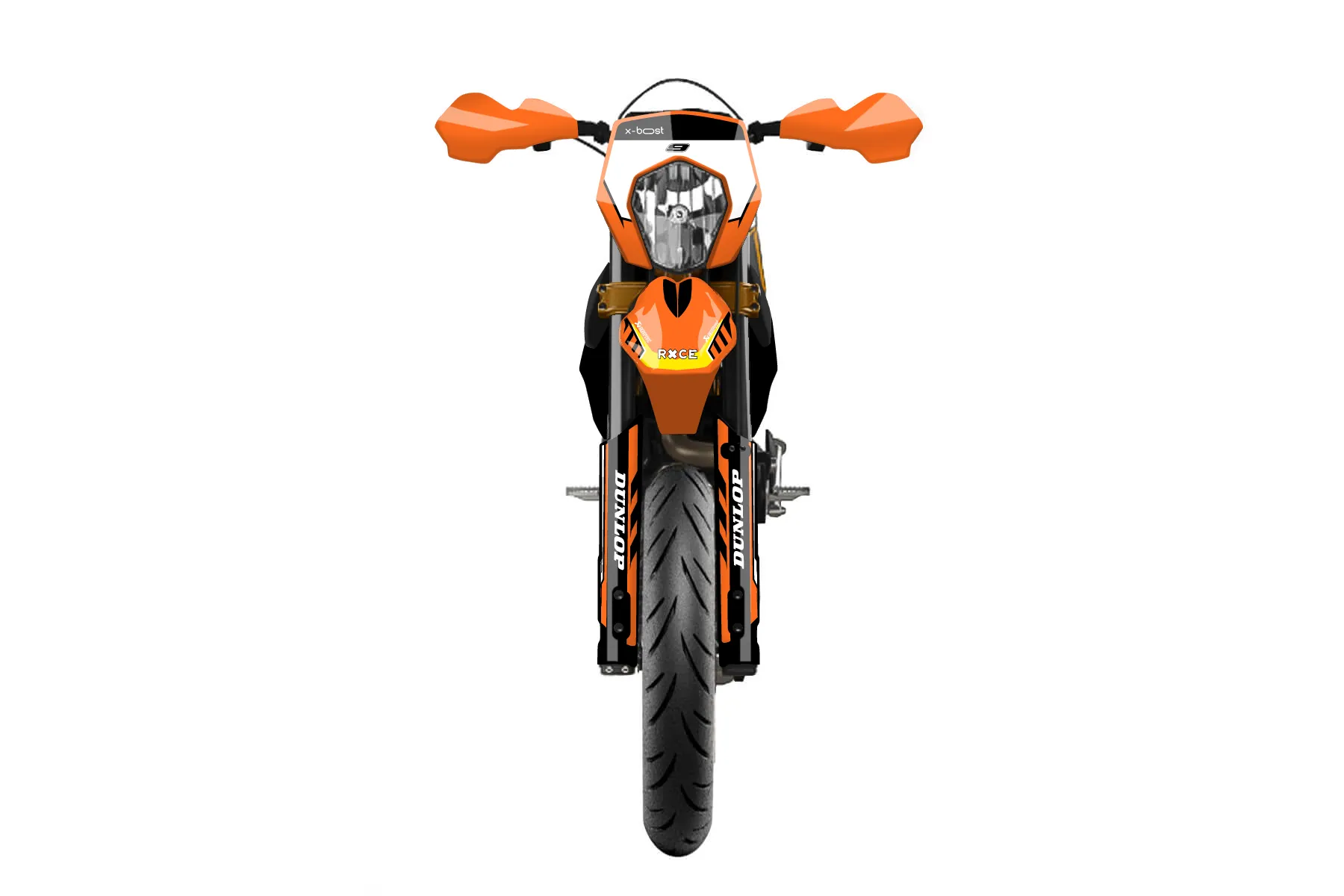 «Rapid» — готовый комплект графики серии Maverick для KTM Street Graphic Kit KTM SMC-R 690 2014. В комплекте: графика на бак и боковые облицовки, крылья (переднее и заднее), передний щиток, номерные таблички, защита вилки. Материал: ПВХ-винил 80 мкр с холодной ламинацией 300 мкр, общая толщина 380 мкр; покрытие глянцевое или матовое на выбор. Устойчив к UV-излучению, воде, бензину и мойке высокого давления. Клей акриловый на сольвентной основе — постоянный, для гибких пластиков. На простых поверхностях монтируется без нагрева; для сложных изгибов рекомендуем фен. Этот пресет можно заказать как есть или взять за основу в конструкторе: поменять цвета, добавить стартовый номер и свой бренд. Производство — 3–5 рабочих дней, доставка по России СДЭКом или Почтой, по СНГ — курьерскими службами.