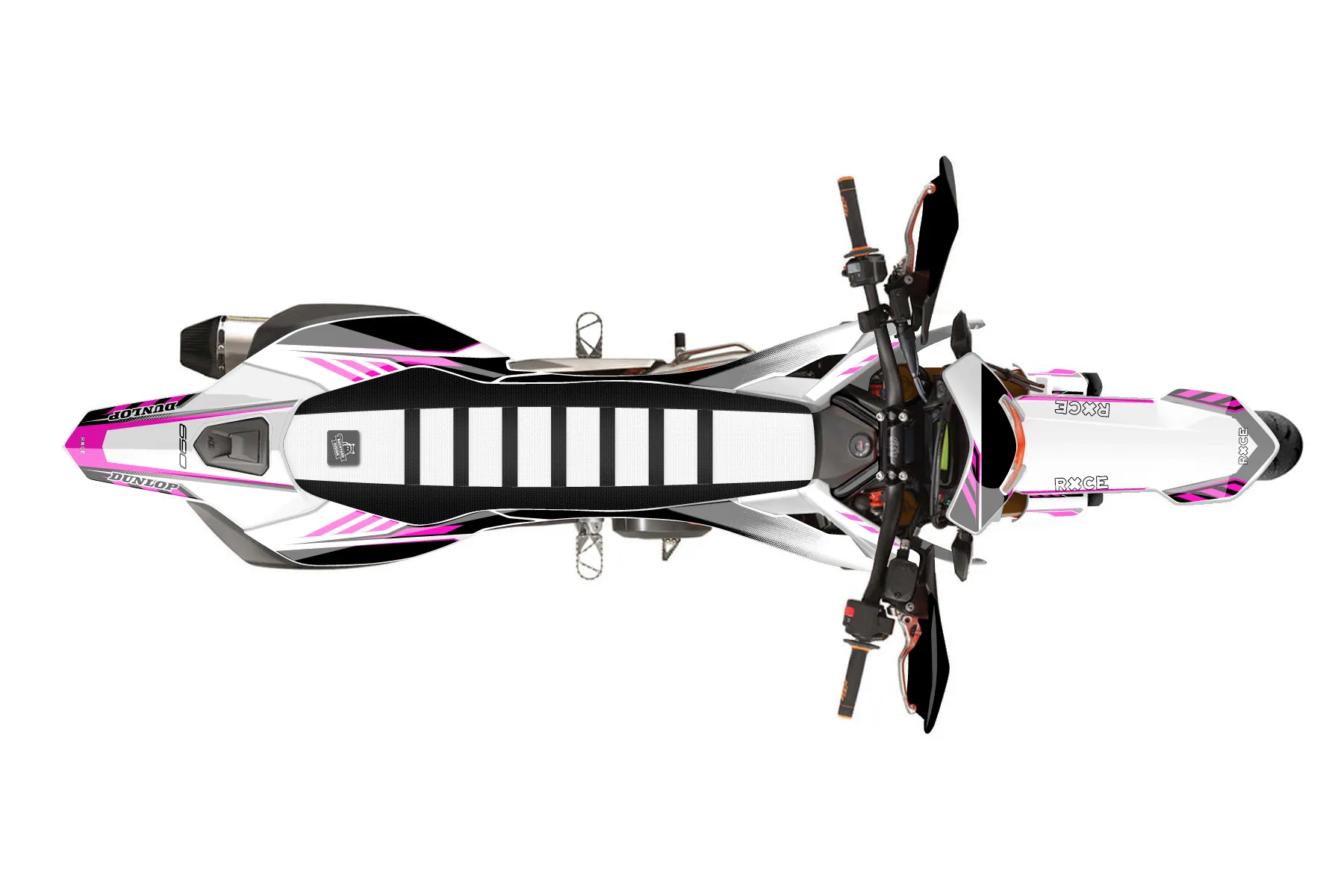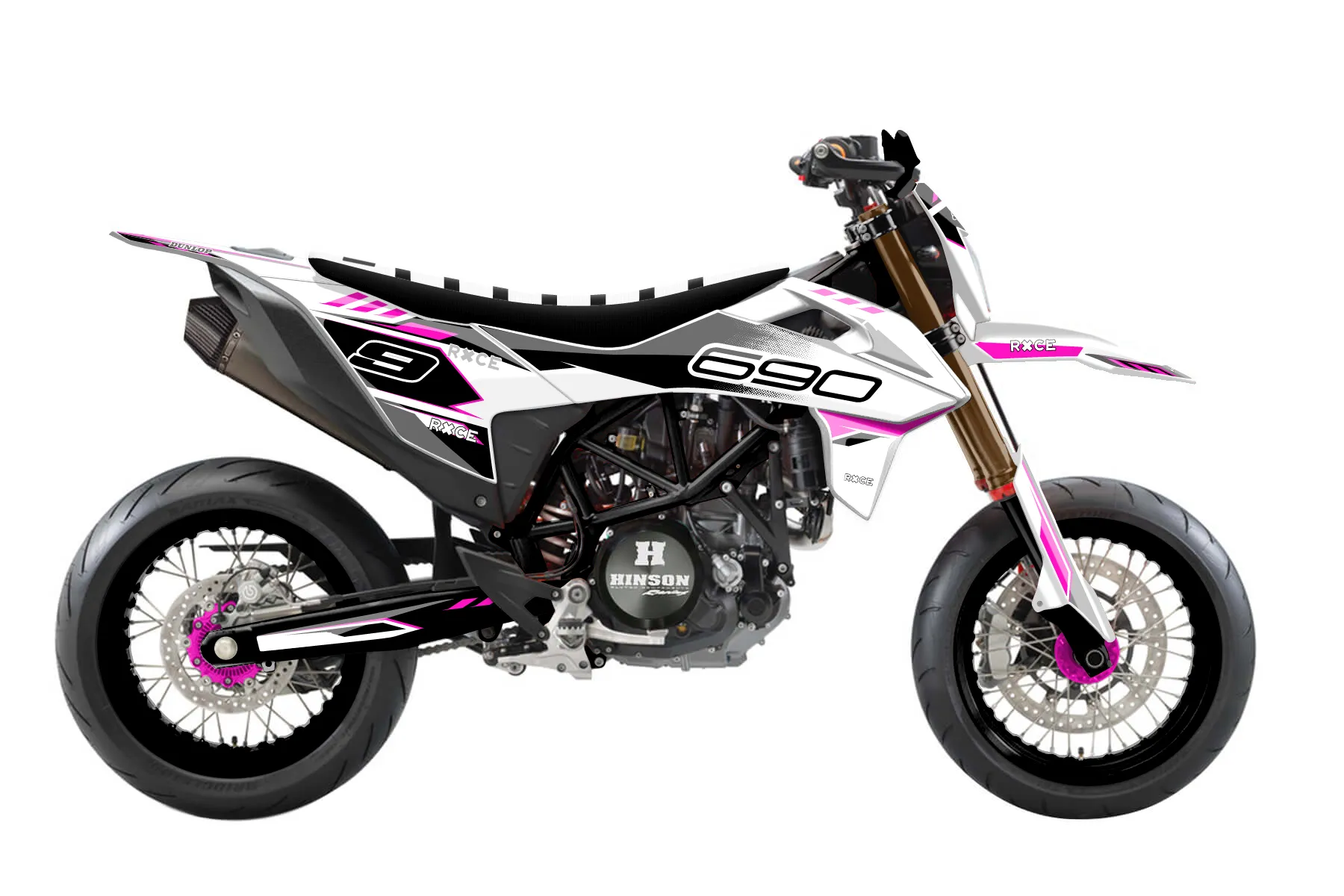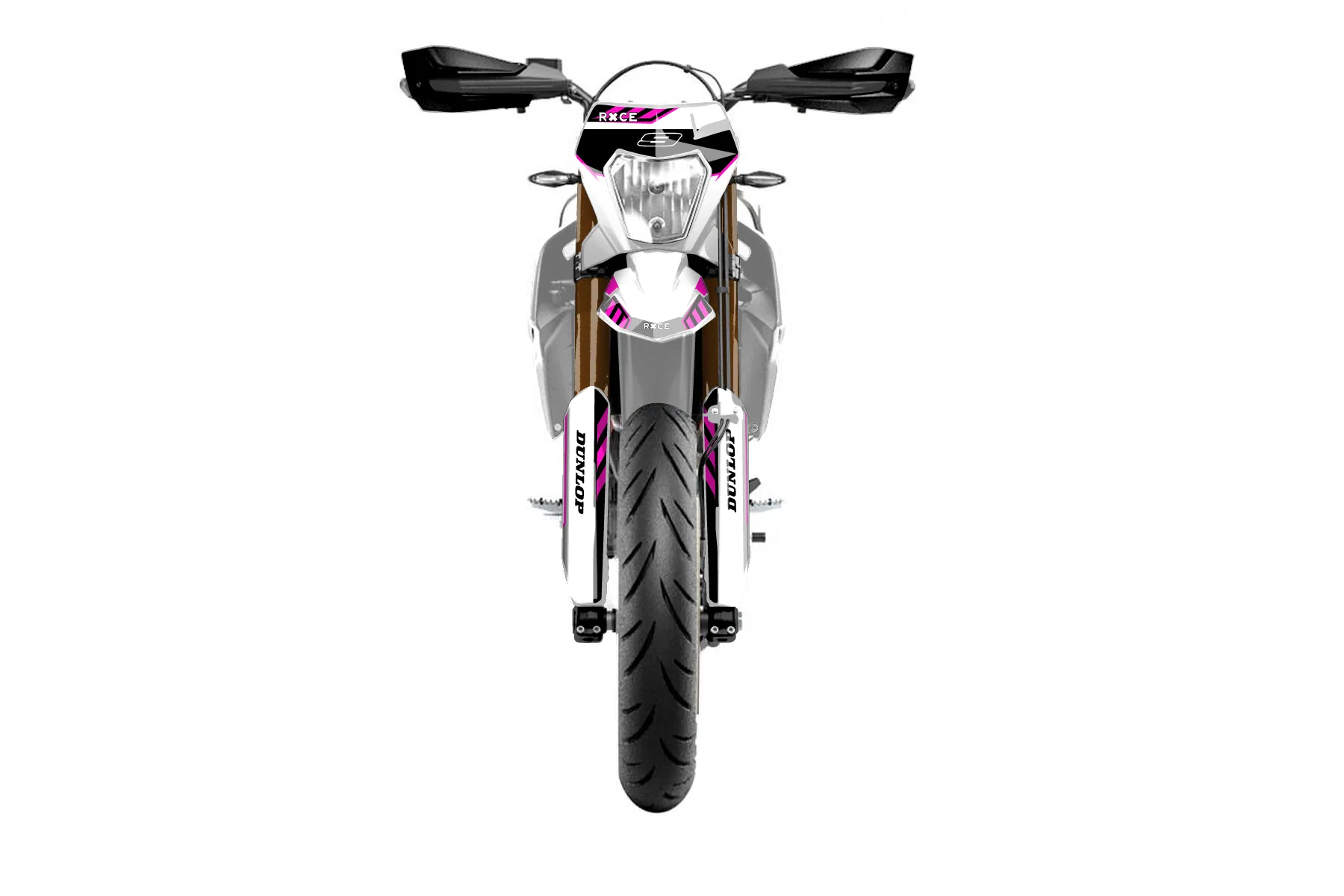 «Satisfied» — готовый комплект графики серии Maverick для KTM Street Graphic Kit KTM SMC-R 690 2019. В комплекте: графика на бак и боковые облицовки, крылья (переднее и заднее), передний щиток, номерные таблички, защита вилки. Материал: ПВХ-винил 80 мкр с холодной ламинацией 300 мкр, общая толщина 380 мкр; покрытие глянцевое или матовое на выбор. Устойчив к UV-излучению, воде, бензину и мойке высокого давления. Клей акриловый на сольвентной основе — постоянный, для гибких пластиков. На простых поверхностях монтируется без нагрева; для сложных изгибов рекомендуем фен. Этот пресет можно заказать как есть или взять за основу в конструкторе: поменять цвета, добавить стартовый номер и свой бренд. Производство — 3–5 рабочих дней, доставка по России СДЭКом или Почтой, по СНГ — курьерскими службами.