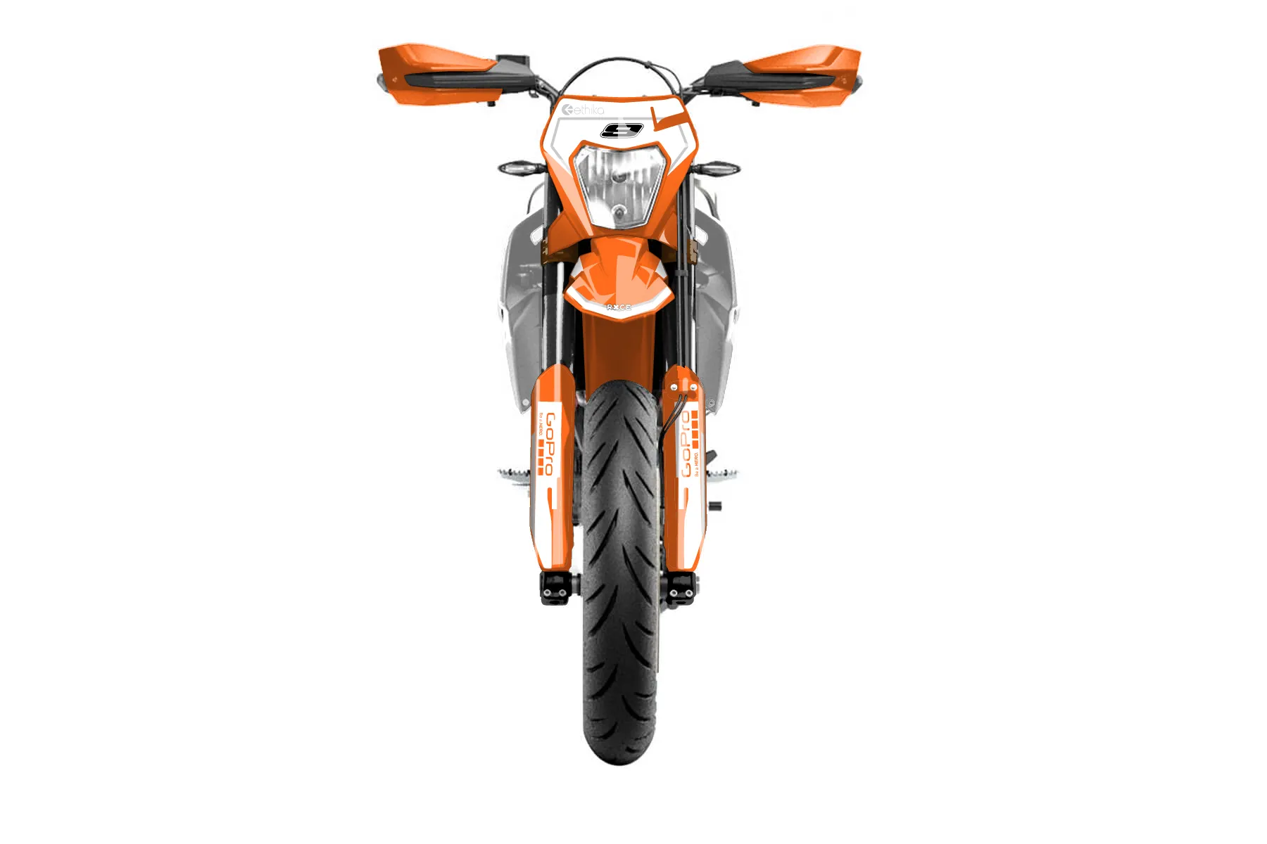 «Rise» — готовый комплект графики серии Staple для KTM Street Graphic Kit KTM SMC-R 690 2019. В комплекте: графика на бак и боковые облицовки, крылья (переднее и заднее), передний щиток, номерные таблички, защита вилки. Материал: ПВХ-винил 80 мкр с холодной ламинацией 300 мкр, общая толщина 380 мкр; покрытие глянцевое или матовое на выбор. Устойчив к UV-излучению, воде, бензину и мойке высокого давления. Клей акриловый на сольвентной основе — постоянный, для гибких пластиков. На простых поверхностях монтируется без нагрева; для сложных изгибов рекомендуем фен. Этот пресет можно заказать как есть или взять за основу в конструкторе: поменять цвета, добавить стартовый номер и свой бренд. Производство — 3–5 рабочих дней, доставка по России СДЭКом или Почтой, по СНГ — курьерскими службами.